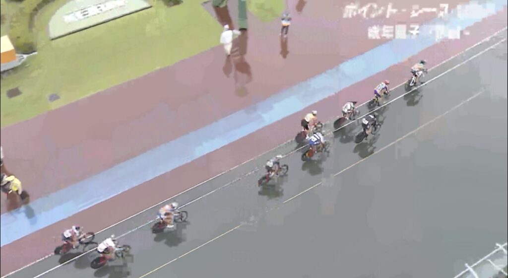 レースは序盤10周くらい、とんでもないペースで回ることになった。動画で見ると(500mバンクなので)あまりわからなかったが、ずっとかかってるし、スピードがありえないくらい早かった。後ろつくだけで精一杯で何度か中切れしそうになった。