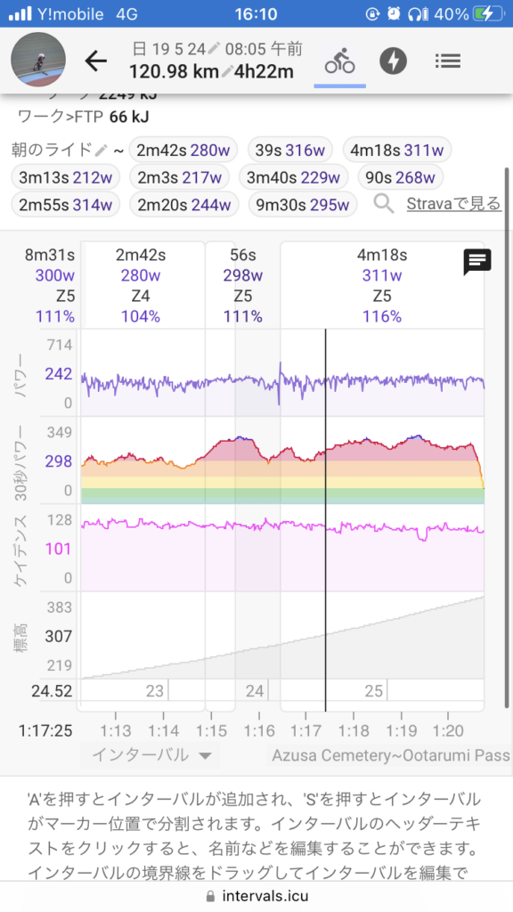 後半は坂全上げ。はせがわがぶいぶいしてた。上半身がたくましくなっていて走りに自信が見えた。えぐかったが途中から気持ちよくなってた。参考坂は二本目が一番感触が良かったが、一番にはなれず。最初の激坂区間で抜かされることが多くmaxパワーが足りてない。そこからみんなが垂れてきたくらいでまくるイメージ。一番よくて50s525wだと思う。intervalicuから