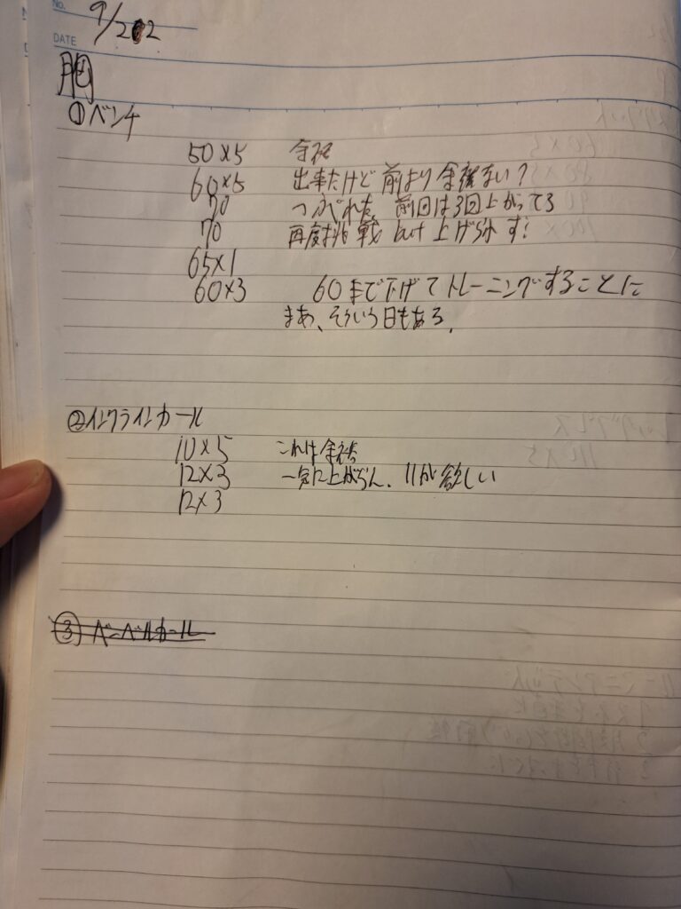 胸はだいぶ弱くなっている。70*3くらいは上がっていたのだが、粘りが足りない。しかし、ここで刺激したのでマッスルメモリー的にもすぐ元に戻るだろう。そういう日もあるということにした。
