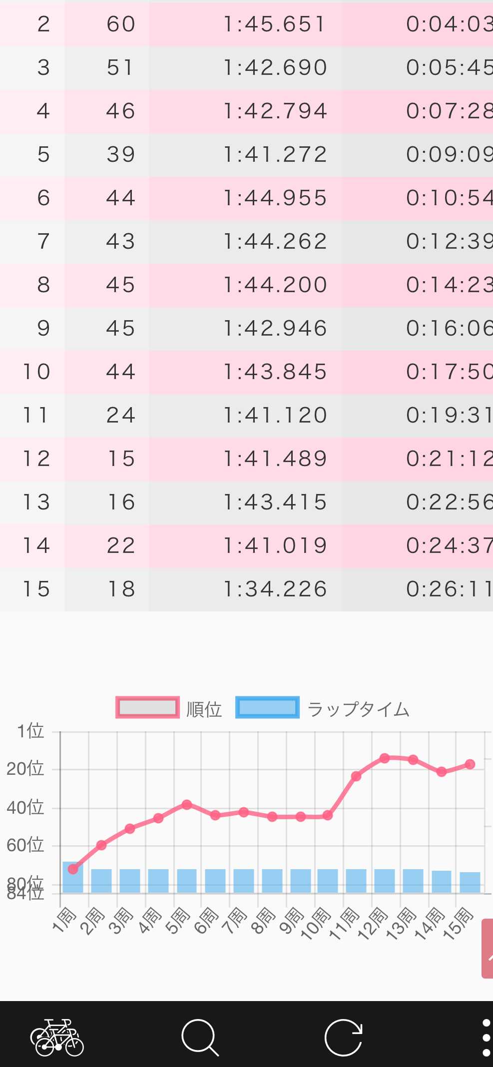 lapclipが見やすいので乗せるが、最初は位置を上げるのに相当苦労して、ずっと辛かった。やばい中切れを埋めるだけで精一杯で、自分の後ろはもう脚が無い人のみで、集団最後尾をキープする形。ようやく長谷川が見える位置くらいまで上げたが、長谷川がこの位置であるということで、脚がある程度残っているメンツが陣取っていて、そこまでひどいインターバルがかからなかったので一旦ここで耐えることにした。自分は20周だと思っていたのだが、10周目ぐらいの落ち着いたところで位置を上げて20番手くらいをキープした。