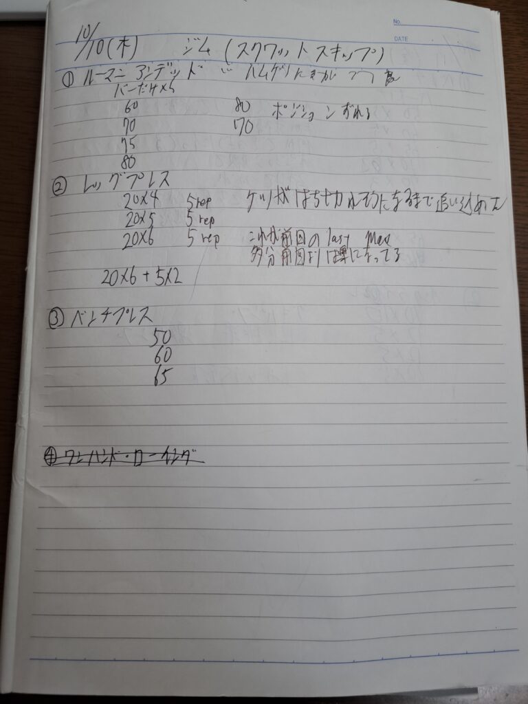 ジムでのウェイトでは、足トレの比重を増やしていくのが理想だが、筋肉痛が抜けるまで3日はかかっているため、現状増やすのは現実的ではない。