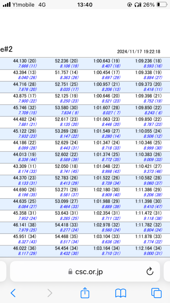 9秒850が私なのだが残り2周の部分は()内が一桁で垂れてないのがわかる。逆にスタンとその返しが周りより1,2秒遅いのでここを改善すればA基準が見えてくると思われる。