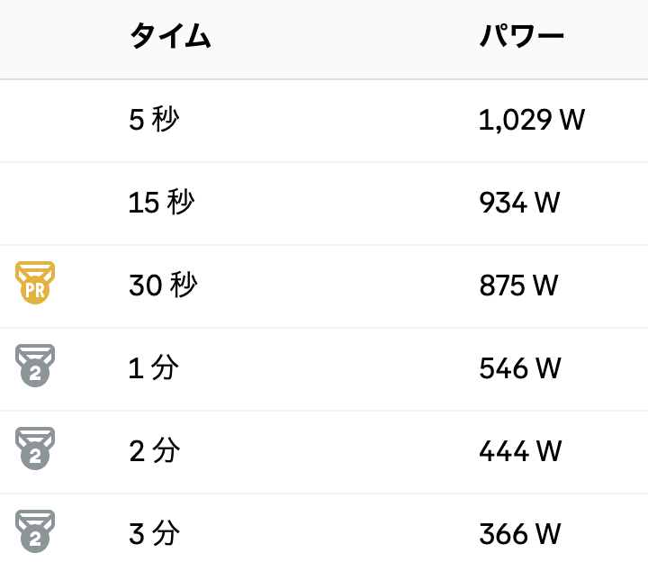 それぞれのタイムとパワーは以下の通り。