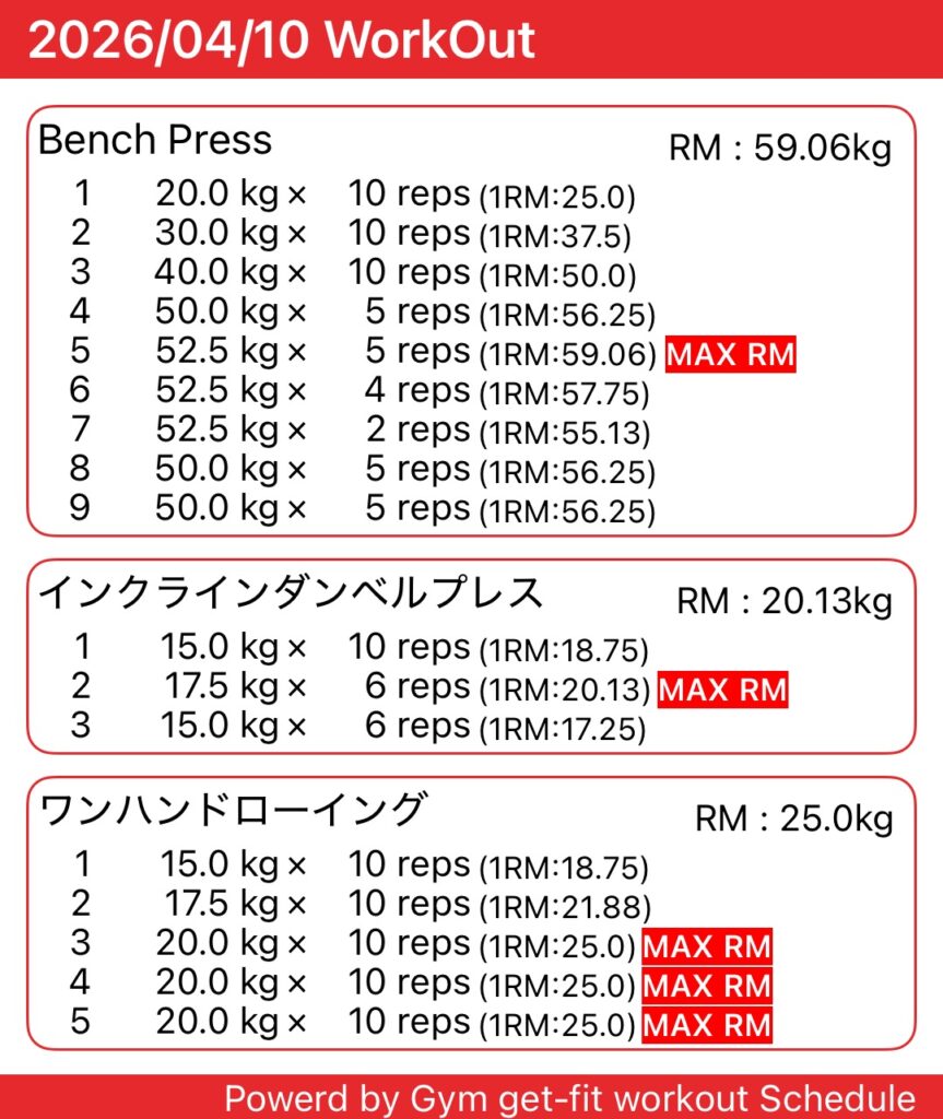 ベンチのmaxRM更新。もっといけそう。心臓破りは胸筋と背筋で上ります。